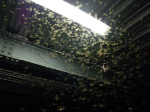 イエシロアリの群飛の特徴は、雨上がりの蒸し暑い風のあまり吹かない夕方18時ごろから、家の電気や街頭に無数の羽アリが飛んできます。