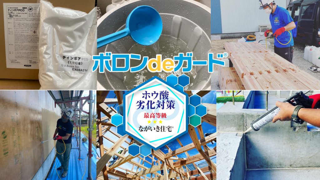 弊社では自然素材のホウ酸塩を主成分とした「ボロンdeガード工法」を施工採用しております。ボロンdeガードではホウ酸の粉末を施工士が調合し水溶液を作成しますので添加物なしの「水とホウ酸のみの100%のホウ酸水溶液」を使用します。