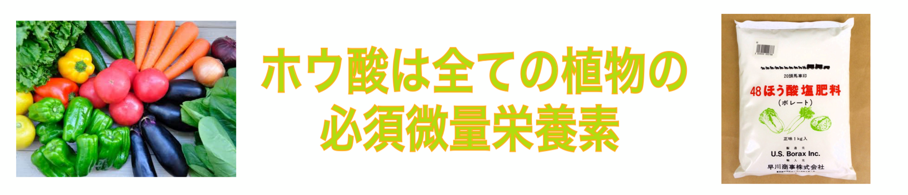 また、植物はホウ酸が無いと枯れてしまいます。全てのホウ酸は微量のホウ酸に依存しながら繁茂を続け、必要なホウ酸を大地や水から調達します。人間は必要なホウ酸を植物から得ています。ホウ酸は植物にとって不可欠であると同時に、人間にとっても栄養学的に重要なのです。