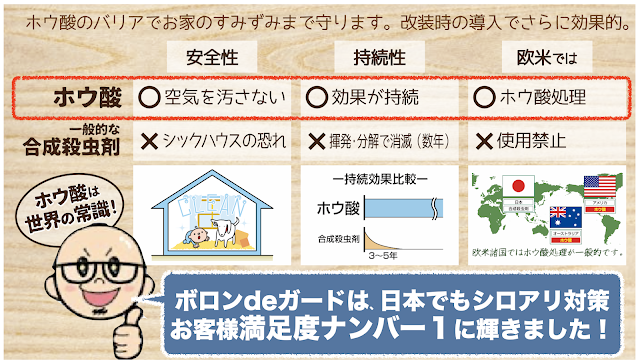 弊社では一般社団法人・日本ホウ酸処理協会の認定施工店としてホウ酸処理/ボロンdeガード工法を施工採用しております。
