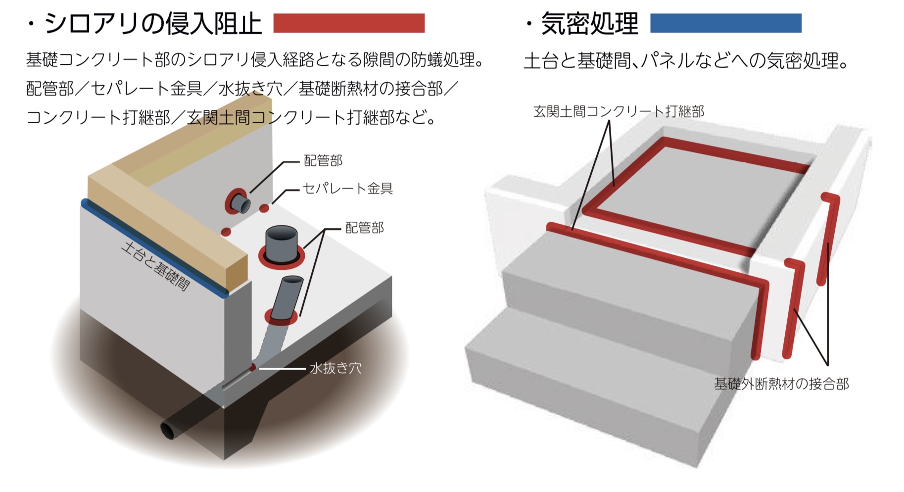 ・土間コンクリートの打ち継ぎ・勝手口の後打ち階段・水抜き穴・セパレート・基礎型枠金具・貫通配管など隙間をそのままにしておくことで築後にシロアリの侵入、被害に繋がるケースがその殆どです。