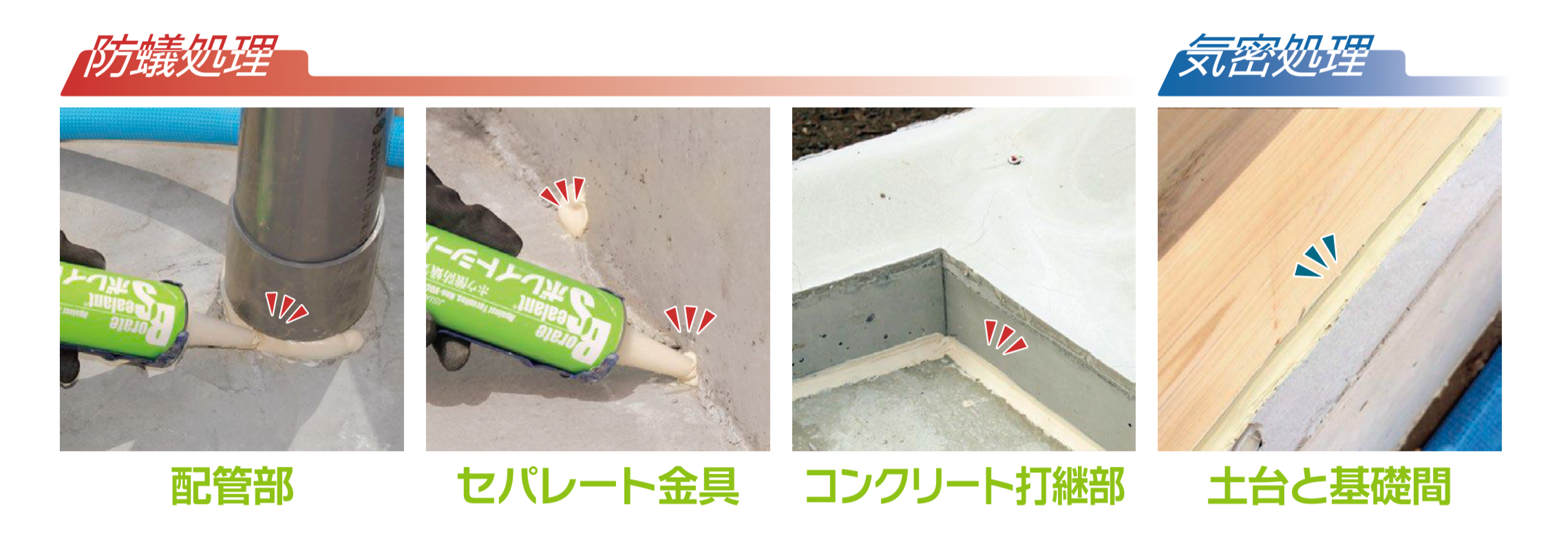 ボロンdeガード工法では僅かな隙間をホウ酸配合気密シーリング材とホウ酸防蟻気密パテ材を使用しシロアリ侵入経路遮断処理を施します。