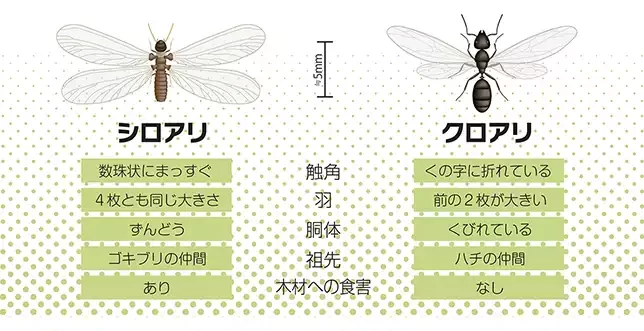 また、外来種のアメリカカンザイシロアリが生息しているエリアでは毎年6月〜10月の日中に飛び立ちます。他の2種と比べても、巣の特徴から準備が整った順から長期間飛び立ちます。