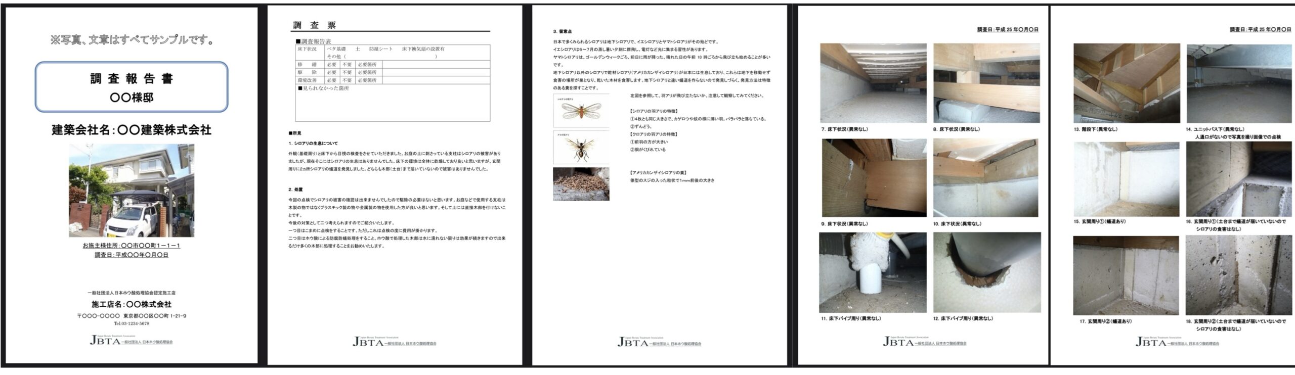 報告書では蟻害と腐朽を中心に家の良いところ、改善が必要なところなど分かりやすく写真にまとめ報告いたします。